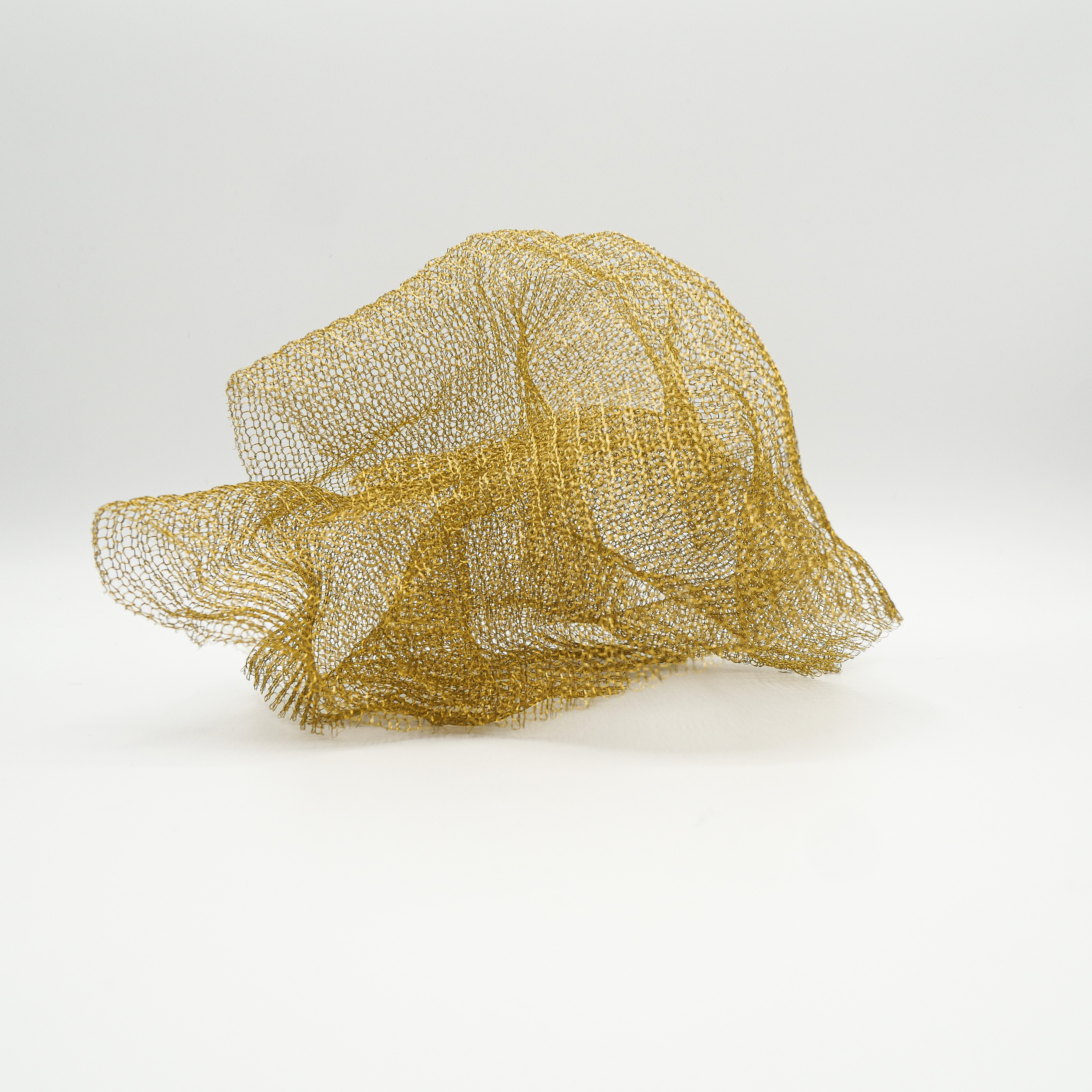 Comme un trompe-l’oeil, ce matériau joue sur la confusion de la perception. Sa forme voilée nous fait penser à une fibre textile fine et vaporeuse. Et pourtant, il s’agit de laiton, un alliage de cuivre et de zinc plus lourd qu’il n’y paraît. Sa couleur vient jouer avec la lumière, sa transparence rythme l’espace.