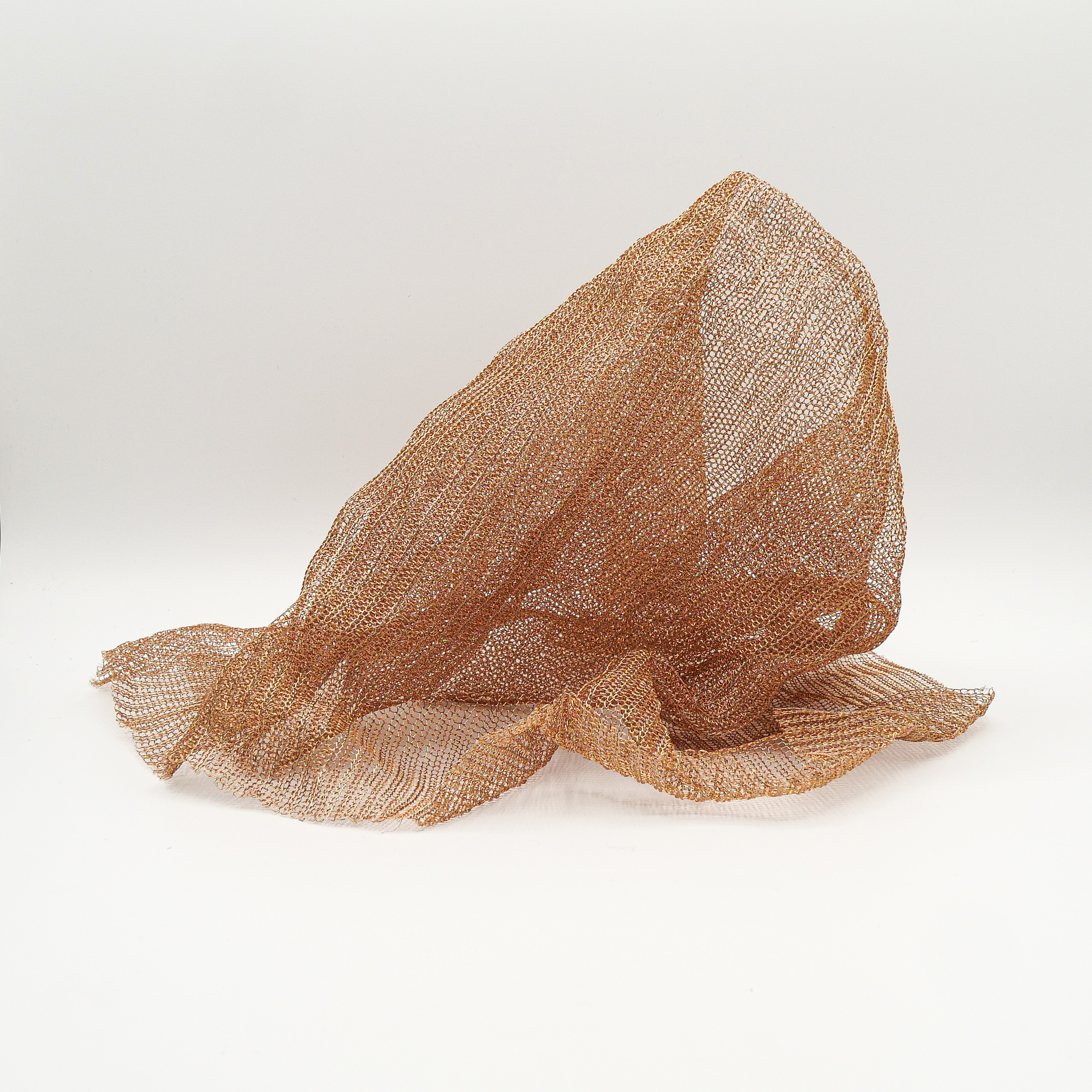 Comme un trompe-l’oeil, ce matériau joue sur la confusion de la perception. Sa forme voilée nous fait penser à une fibre textile fine et vaporeuse. Et pourtant, il s’agit de laiton, un alliage de cuivre et de zinc plus lourd qu’il n’y paraît. Sa couleur vient jouer avec la lumière, sa transparence rythme l’espace.