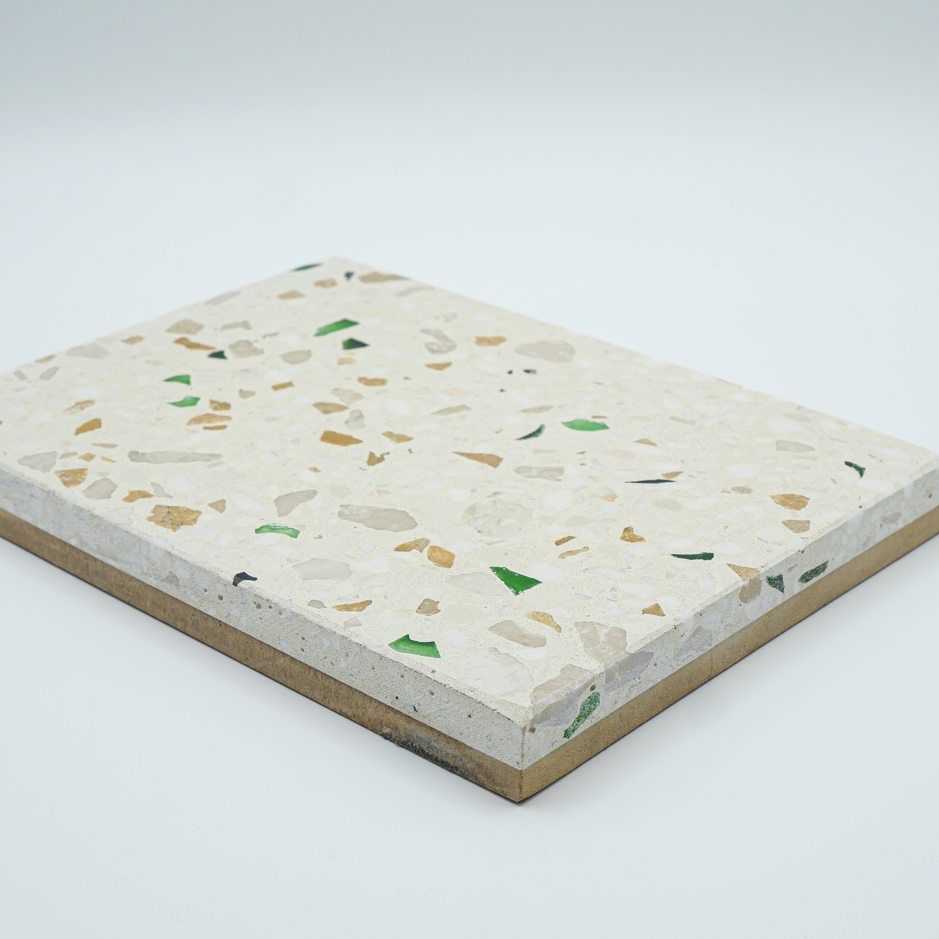 Un agglomérat de fragments de pierres, d’éclats de marbre et de bouts de verre, le tout lié à du ciment. C’est le terrazzo, le vrai.